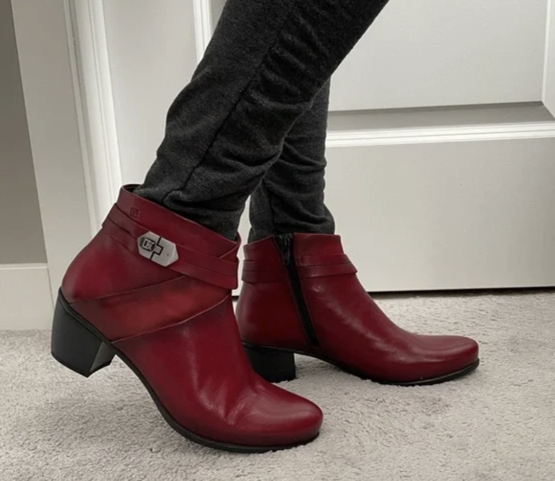 The Black Ankle Boot from Dorking is sleek and versatile. The low heel is comfortable for walking—great support without wobbling. Leather is high quality—soft inside, durable outside. Ankle height is perfect—not too high or low. Zipper makes it easy to slip on. Pairs beautifully with jeans or skirts for office or casual. No rubbing or blisters—cushioned footbed is a blessing. These boots look expensive but feel like sneakers—perfect fall/winter staple!